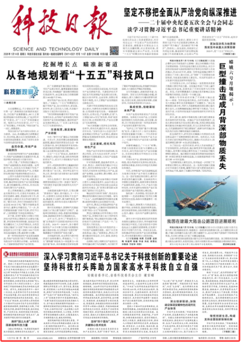 《科技日報》2026年1月14日01版 1月14日,《科技日報》頭版刊發(fā)安徽省委書記、省委科技委員會主任梁言順的署名文章《深入學(xué)習(xí)貫徹習(xí)近平總書記關(guān)于科技創(chuàng)新的......